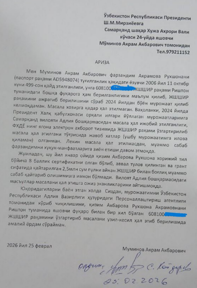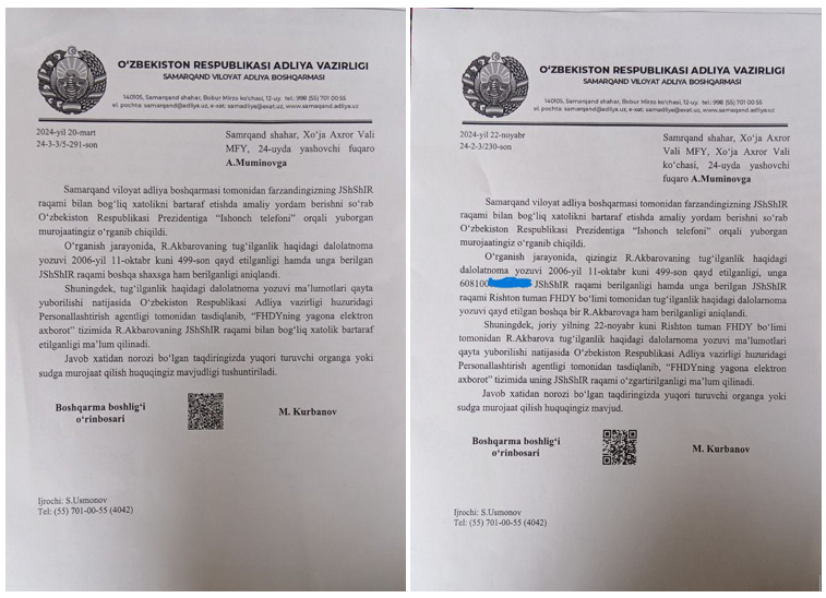 Илова қилинган жавоб хатларининг нусхаларига кўз югуртиринг. Самарқанд вилоят адлия бошқармасининг 2024 йил 24 мартдаги хатида “Р.Акбарованинг ЖШШИР билан боғлиқ хатолик бартараф этилганлиги” айтилган. Аммо ҳеч нарса ўзгармаган. Рухшонанинг бошқа бир мурожаатига Адлия бошқармасидан 2024 йилнинг 20 ноябрида яна жавоб келади. Унда март ойида берилган жавоб такрорланган, яъни ЖШШИР билан боғлиқ хатолик бартараф этилганлиги маълум қилинган. Аммо…